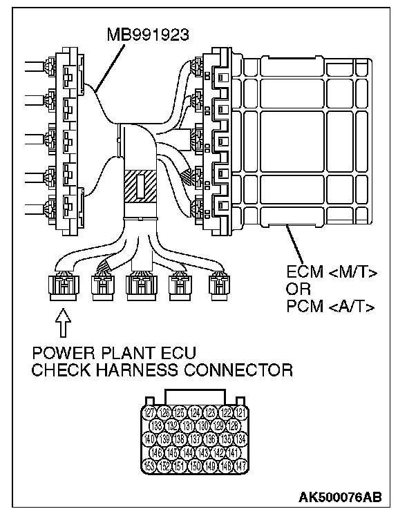 1. Disconnect all ECM [M/T] connectors or PCM [A/T] connectors. Connect the check harness special tool (MB991923) between the separated connectors.
