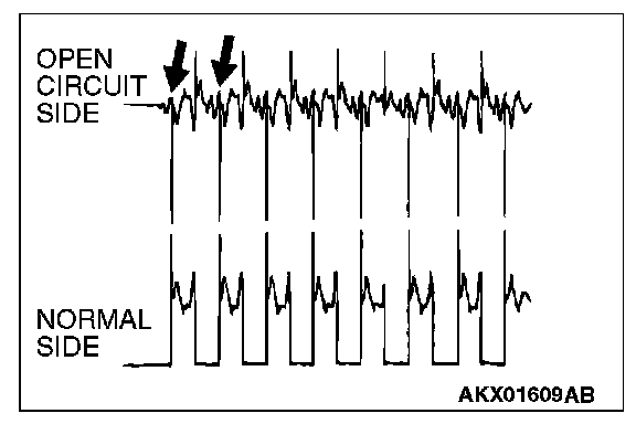 - Current is not supplied to the motor coil on the open circuit side. (Voltage does not drop to 0 volt.) Furthermore, the induced electromotive force wave pattern at the normal side is slightly different from the normal wave pattern.
