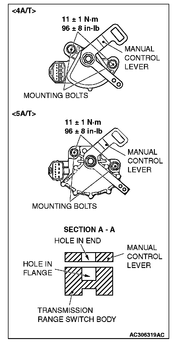 NOTE: The transmission range switch body can be aligned by inserting a 5-mm diameter steel bar into the end hole of the manual control lever and the flange hole of the transmission range switch body.