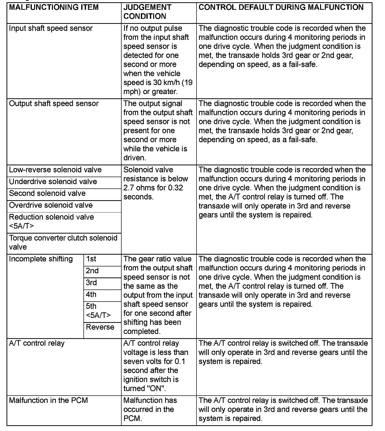 FAIL-SAFE/BACKUP FUNCTIONWhen a malfunction of a main sensor or actuator is detected by the PCM, the transaxle is controlled by preset control logic to maintain safe conditions for driving.