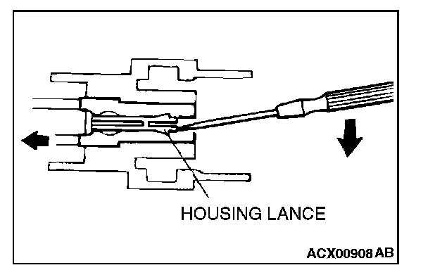 2. Insert the tip of the screwdriver [1.4 mm (0.06 inch) or 2.0 mm (0.08 inch) width] into the connector as shown in the figure, raise the housing lance slightly with the tip, and pull out the terminal.