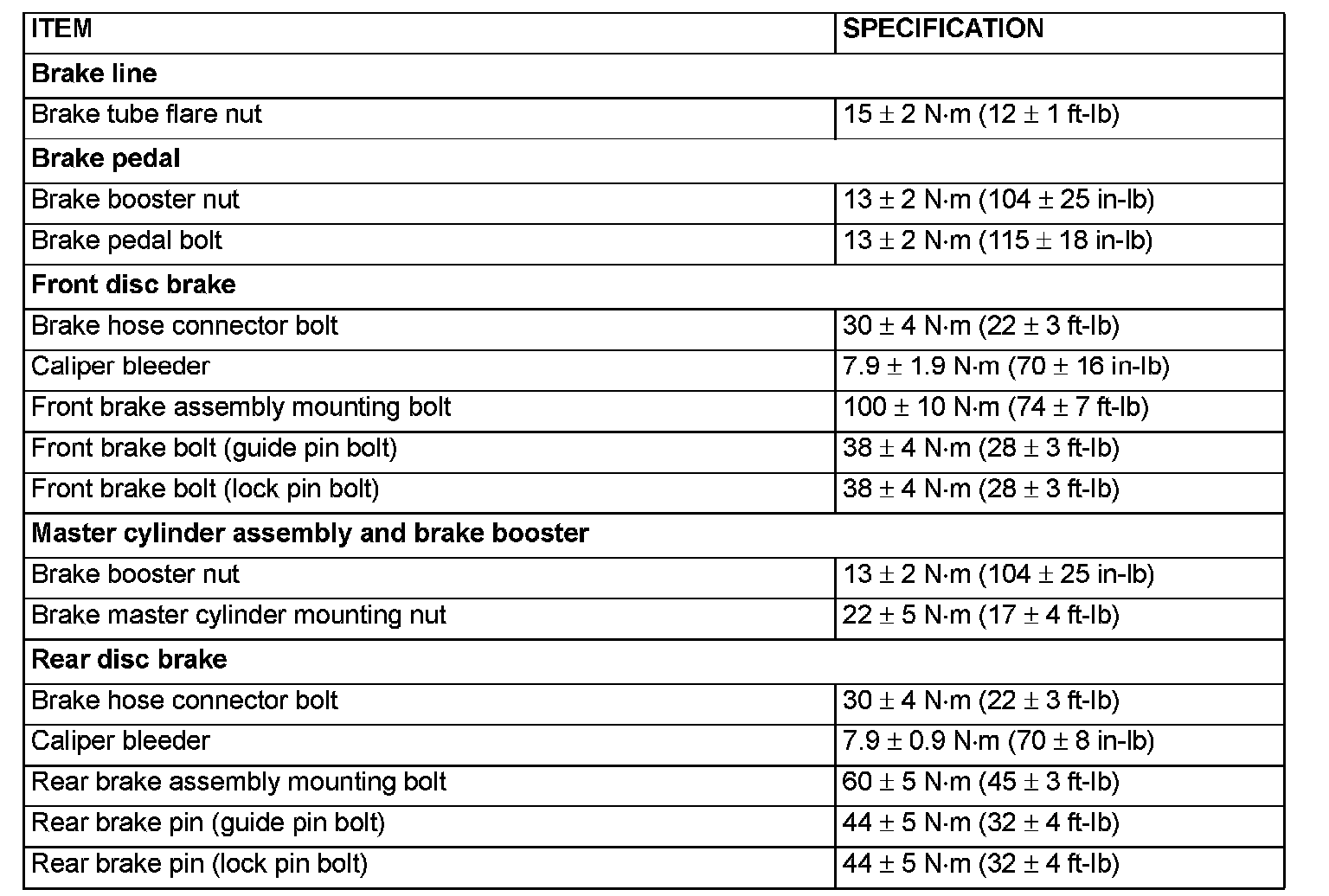 FASTENER TIGHTENING SPECIFICATIONS: