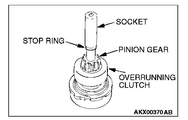 1. Press a long socket wrench of appropriate size to the stop ring. Then tap the socket wrench to remove the stop ring to the pinion gear side.