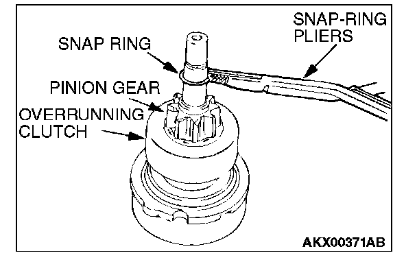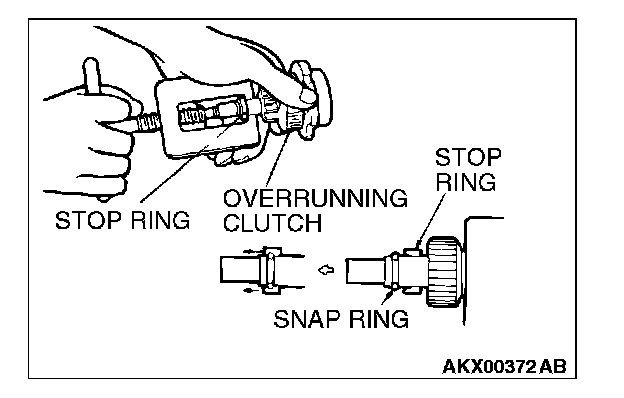 2. After removing the snap ring (by using snap-ring pliers), remove the stop ring and the overrunning clutch.