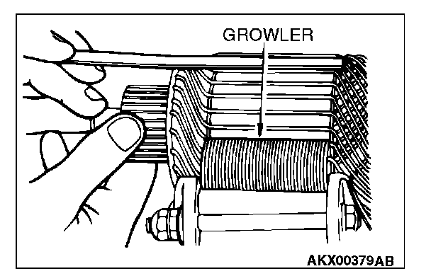 3. Hold a thin steel blade parallel and just above while rotating the armature slowly in the growler. A shorted armature will cause a blade to vibrate and be attracted to the core. Replace the shorted armature.