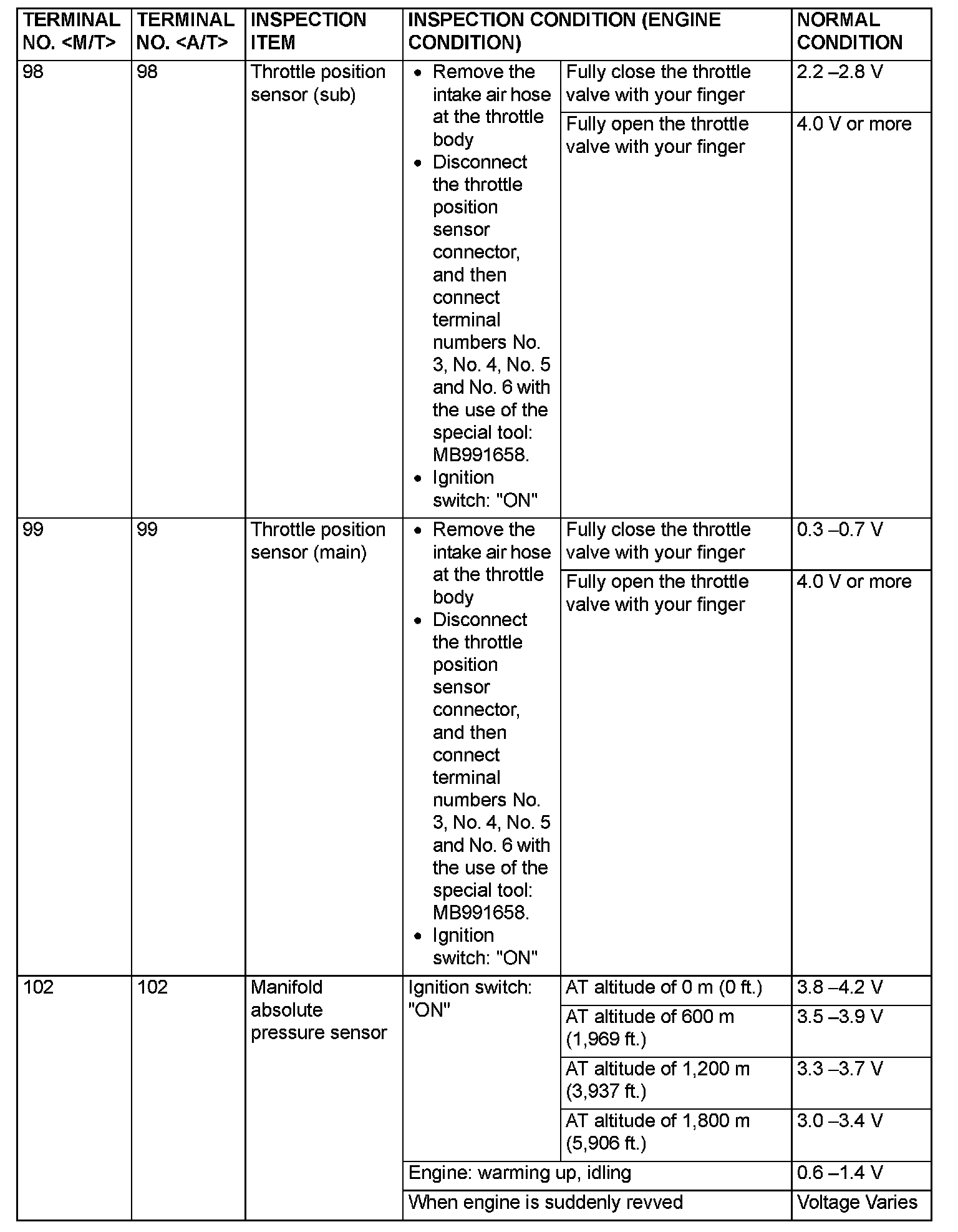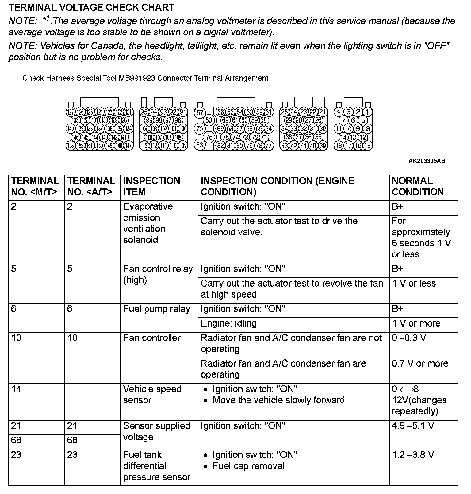1. Disconnect the ECM [M/T] or the PCM [A/T] connectors B-19, B-20, B-21, B-22 and B-23, and connect check harness special tool MB991923 between the ECM [M/T] connectors or the PCM [A/T] connectors.