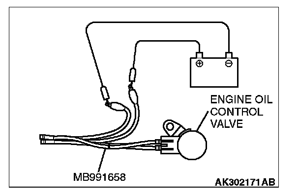 2. Check that the operation sound of the engine oil control valve can be heard when the positive battery voltage is supplied to the engine oil control valve. (Use the jumper wires to connect terminal No. 2 of the engine oil control valve connector to the positive battery terminal and terminal No. 1 to the negative battery terminal.)
