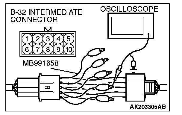 2. Connect the oscilloscope probe to each intermediate connector B-32 terminal to analyze each cylinder: