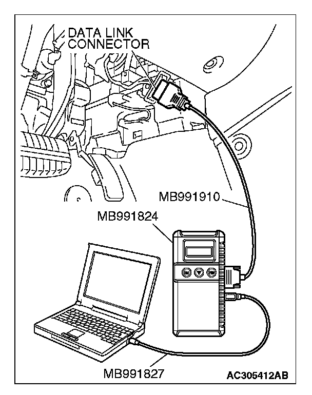 CAUTION: To prevent damage to scan tool MB991958, always turn the ignition switch to the "LOCK" (OFF) position before connecting or disconnecting scan tool MB991958.