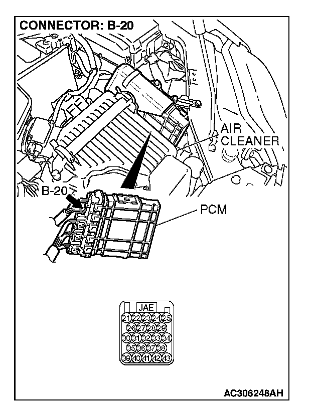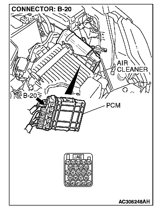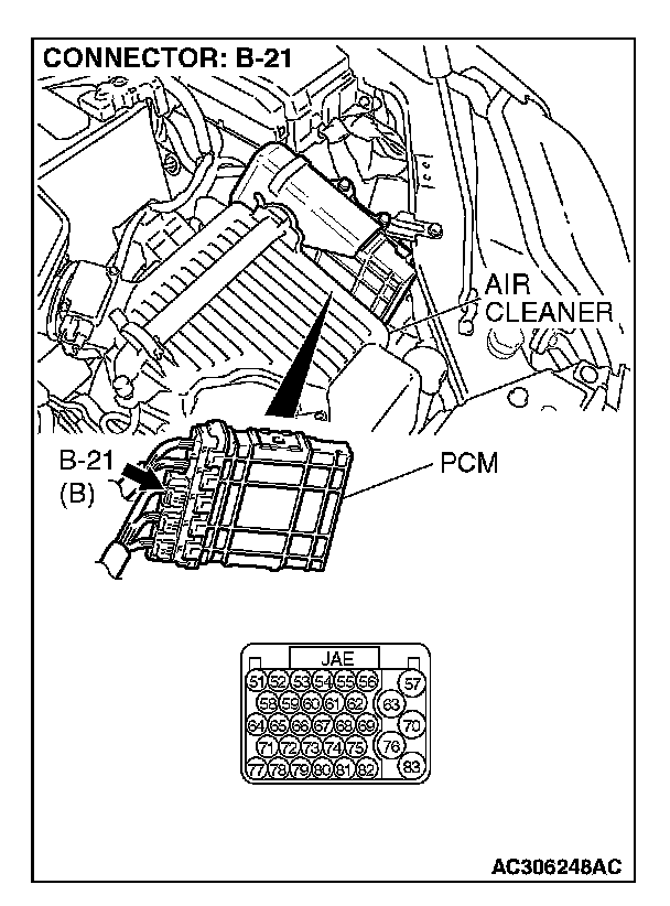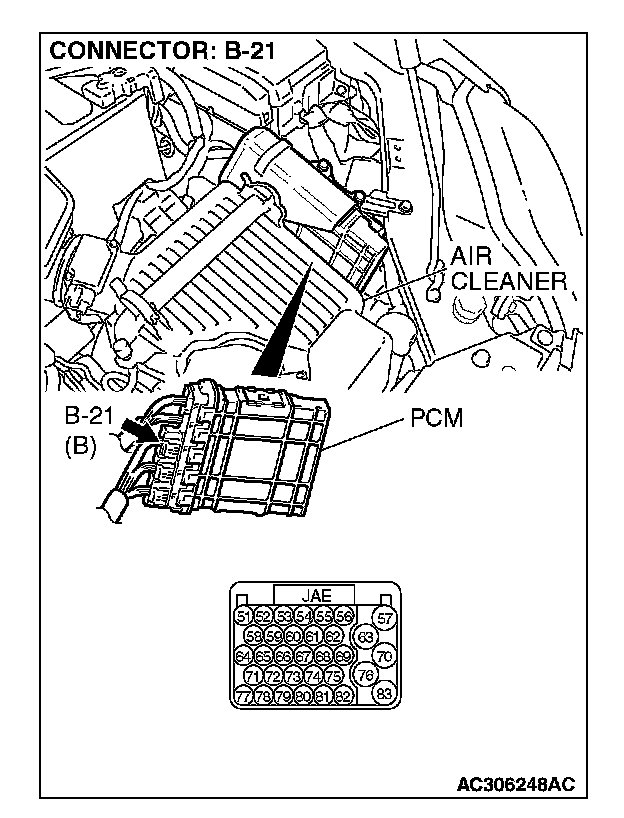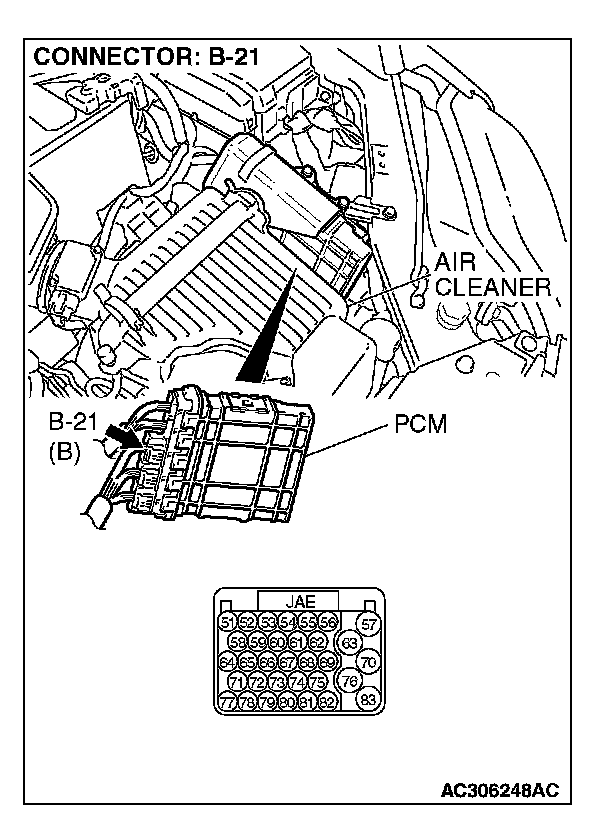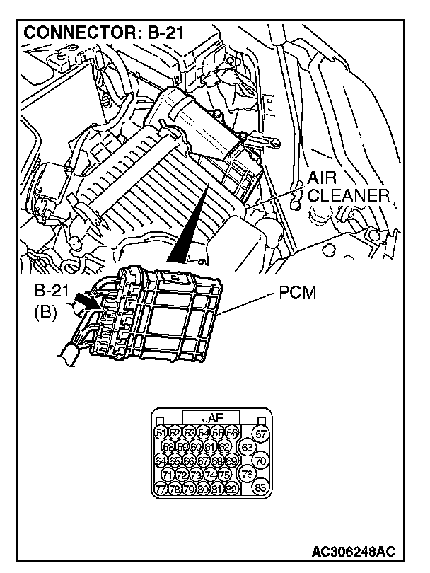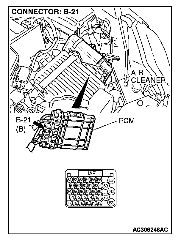 STEP 3. Check PCM connector B-21 for loose, corroded or damaged terminals, or terminals pushed back in the connector.