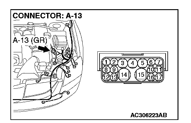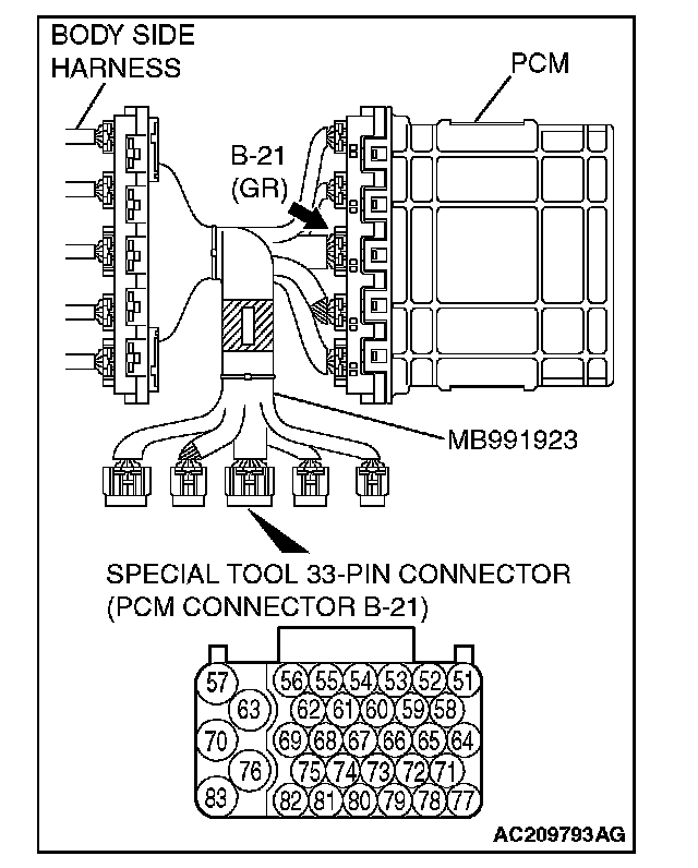 (2) Connect special tool MB991923 (check harness) between the PCM and the body-side harness connector.