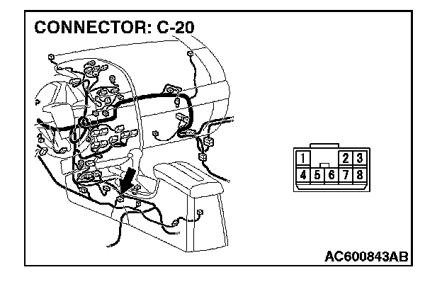 STEP 12. Check intermediate connector A-13, PCM connector B-20 and shift switch assembly connector C-20 for loose, corroded or damaged terminals, or terminals pushed back in the connector.