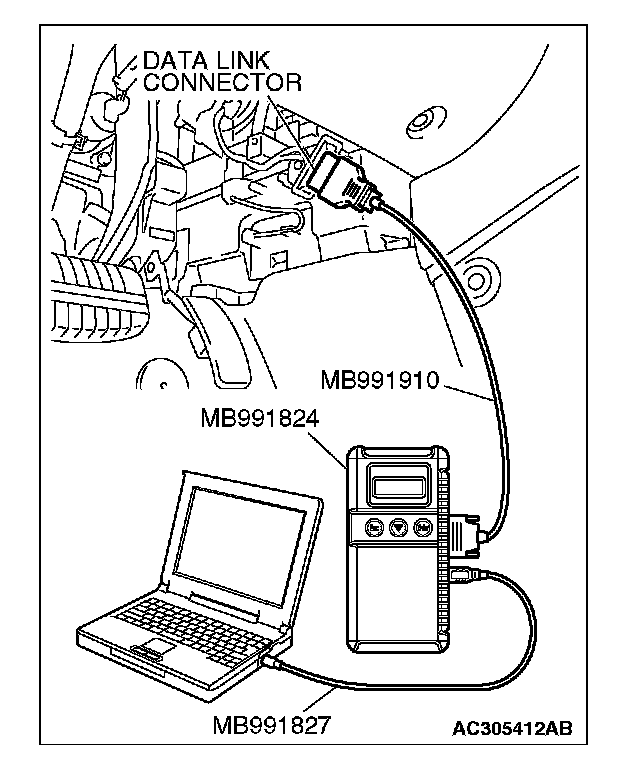 CAUTION: To prevent damage to scan tool MB991958, always turn the ignition switch to the "LOCK" (OFF) position before connecting or disconnecting scan tool MB991958.