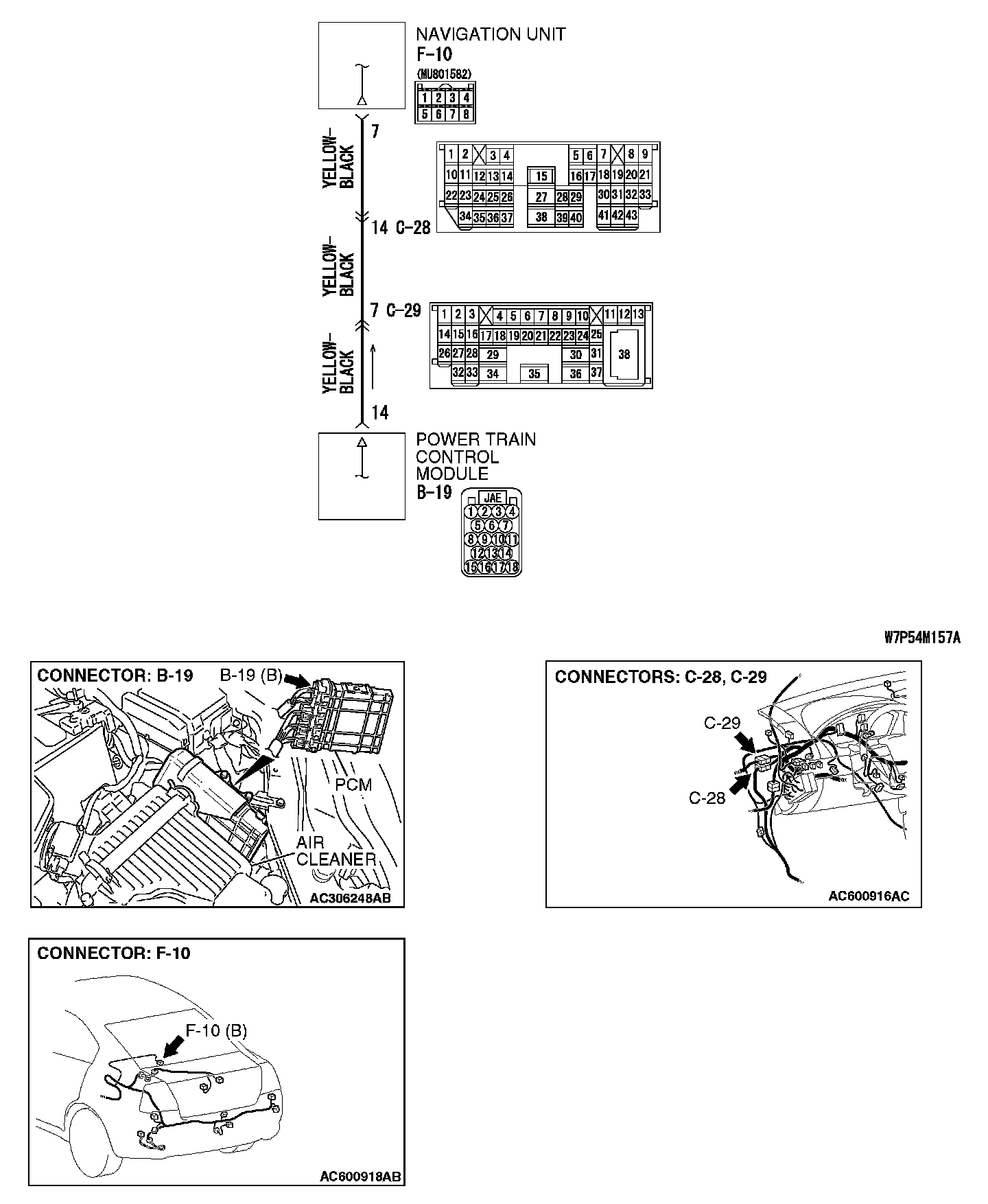 STEP 6. Check the wiring harness between navigation unit connector F-10 (terminal 7) and power train control module connector B-19 (terminal 14).