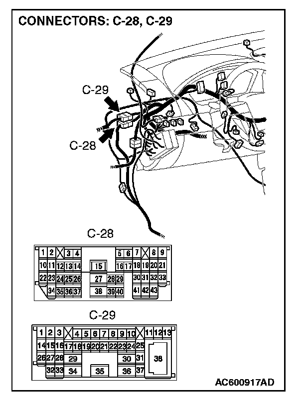 NOTE: Also check intermediate connector C-28 and C-29 for loose, corroded, or damaged terminals, or terminals pushed back in the connector. If intermediate connector C-28 and C-29 are damaged, repair or replace the damaged component(s) as described in General (Electrical), Harness Connector Inspection.