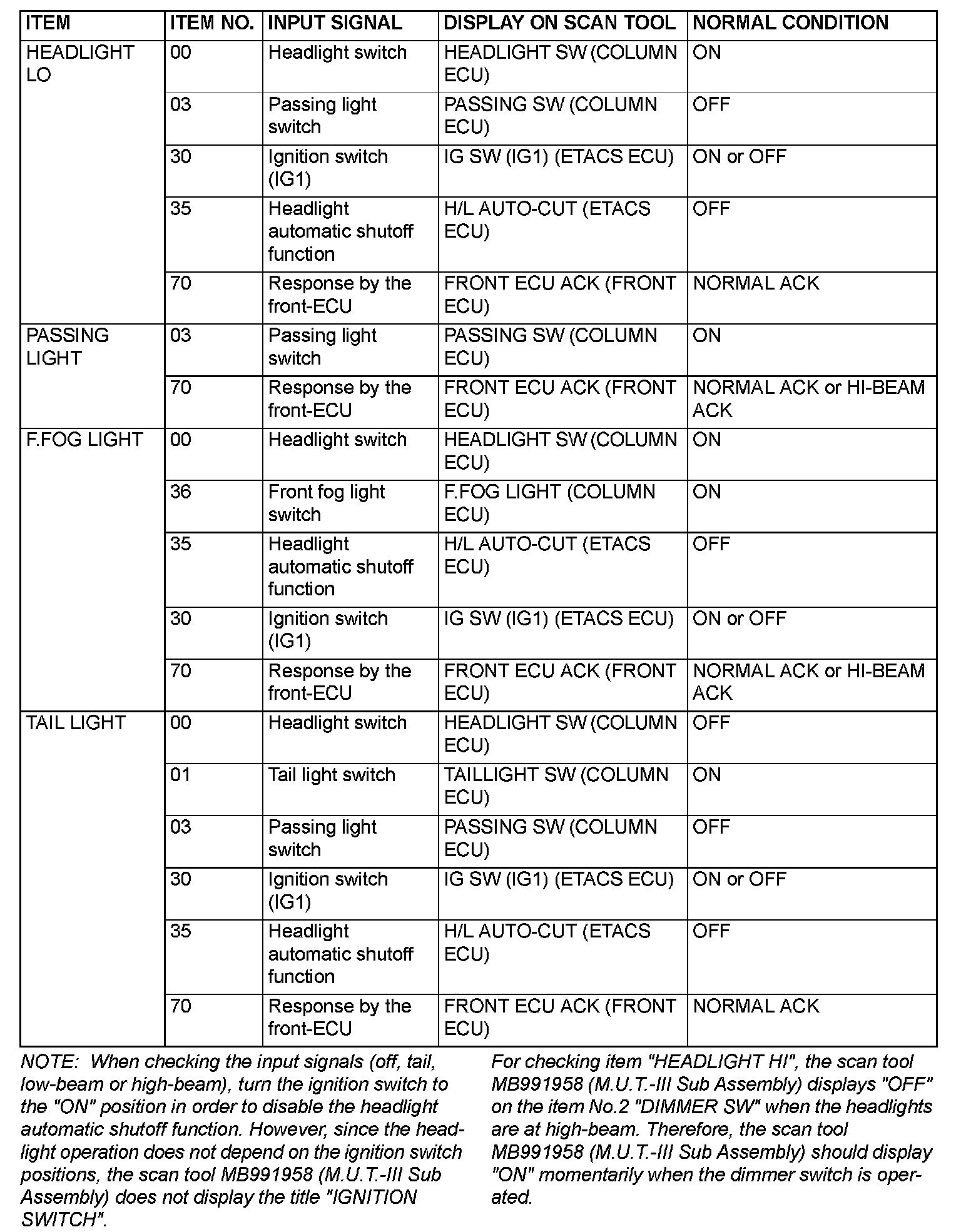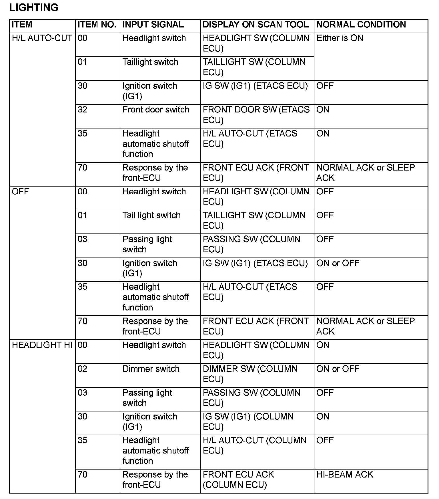 The table below shows the service data and their normal condition, which are displayed during the "Function Diag." The column "Normal condition" shows values that are shown when each operation is made.