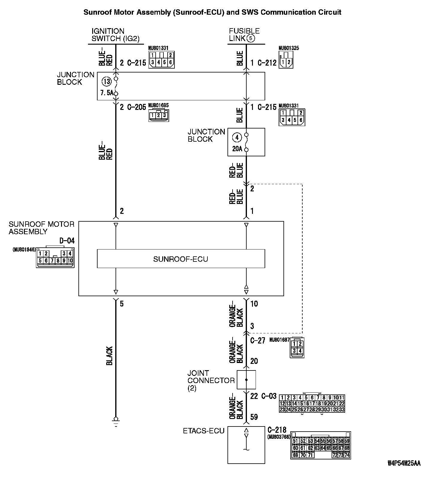 Q: Is the wiring harness between sunroof motor assembly connector D-04 (terminal 10) and ETACS-ECU connector C-218 (terminal 59) in good condition?