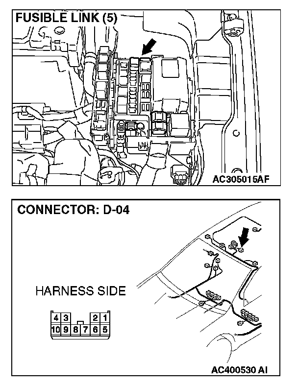 STEP 2. Check the fusible link (5) line of power supply circuit to the sunroof motor assembly. Measure the voltage at sunroof motor assembly connector D-04.