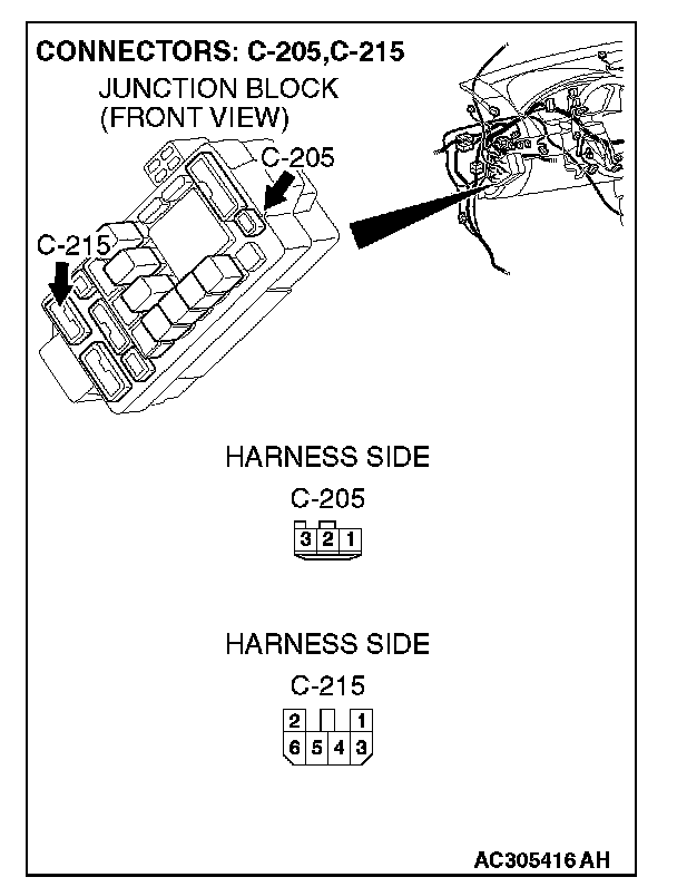 NOTE: Also check junction block connectors C-215 and C-205 for loose, corroded, or damaged terminals, or terminals pushed back in the connector. If junction block connector C-215 or C-205 is damaged, repair or replace the damaged component(s) as described in General (Electrical), Harness Connector Inspection.