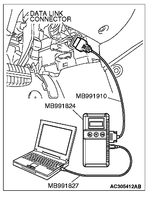 CAUTION: To prevent damage to scan tool MB991958, always turn the ignition switch to the "LOCK" (OFF) position before connecting or disconnecting scan tool MB991958.