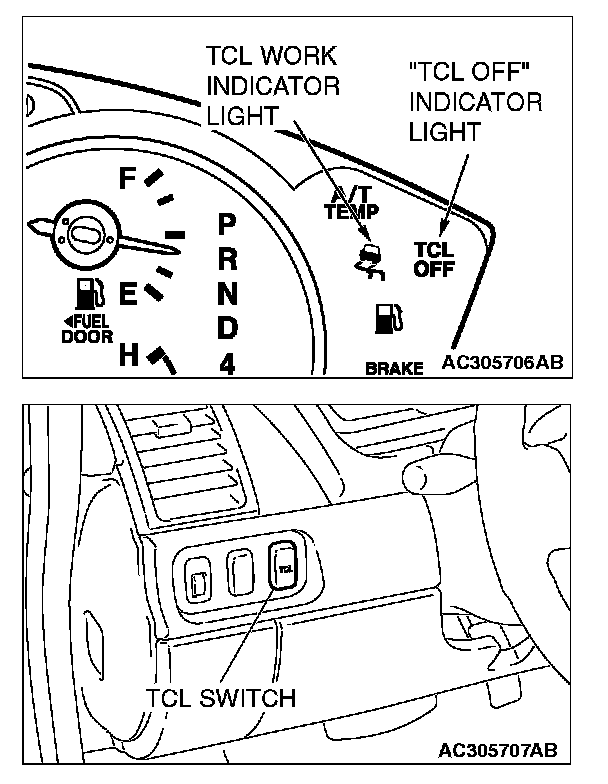 TCL INDICATOR LIGHT CHECK1. Check that the "TCL OFF" indicator light and the TCL work indicator light illuminate for three seconds when the ignition switch is turned to the "ON" position.