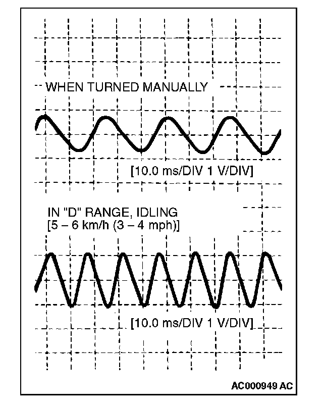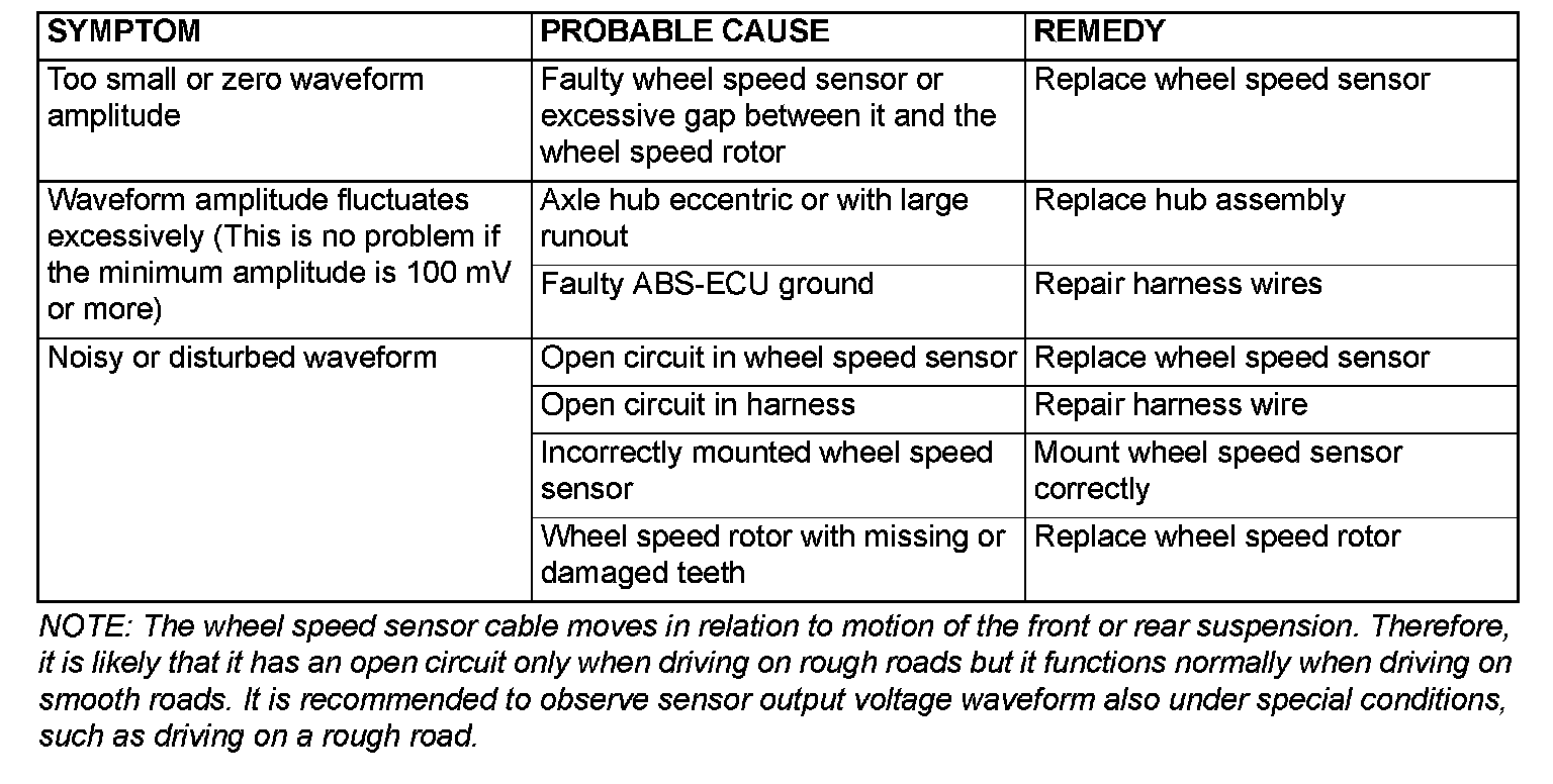 NOTE: The output waveform is low when the wheel speed is low. Similarly, it will be higher as the wheel speed increases. Waveform may also be observed by driving the vehicle.