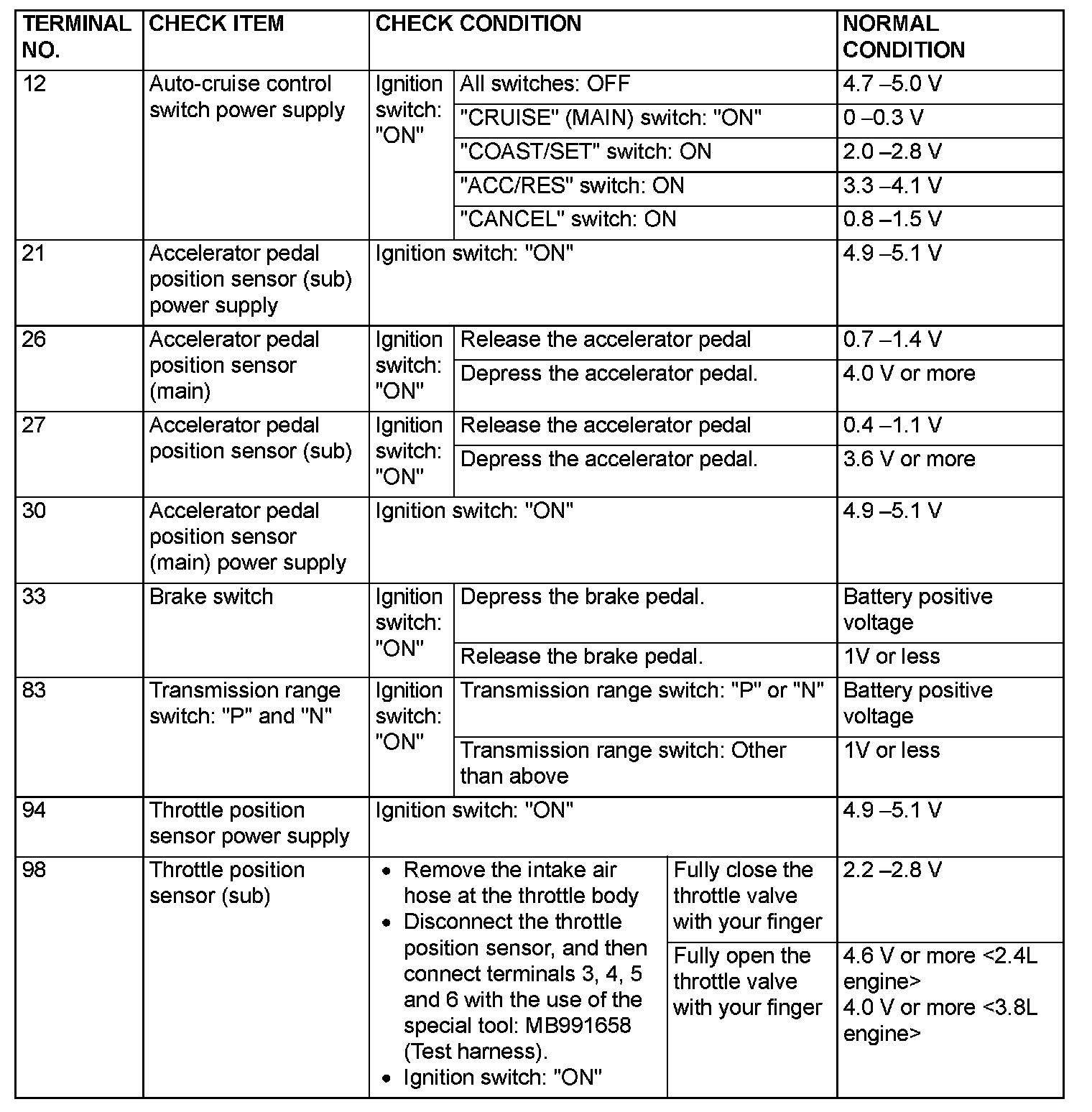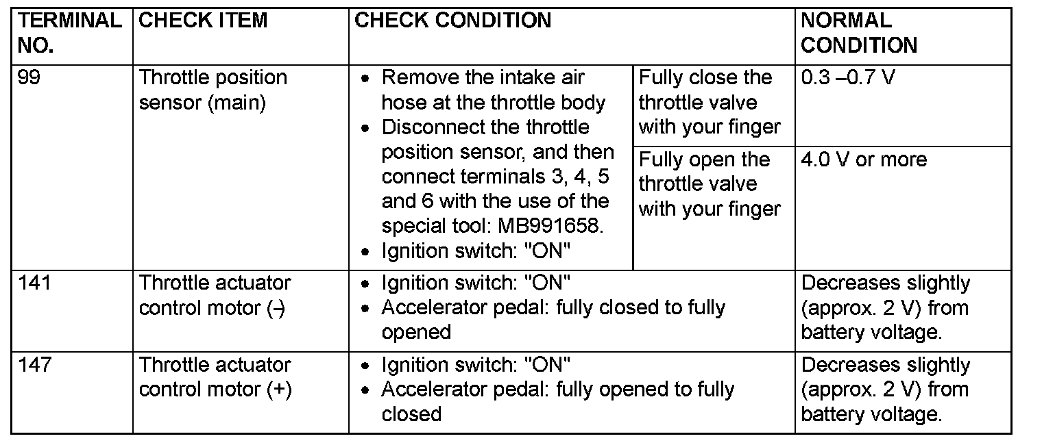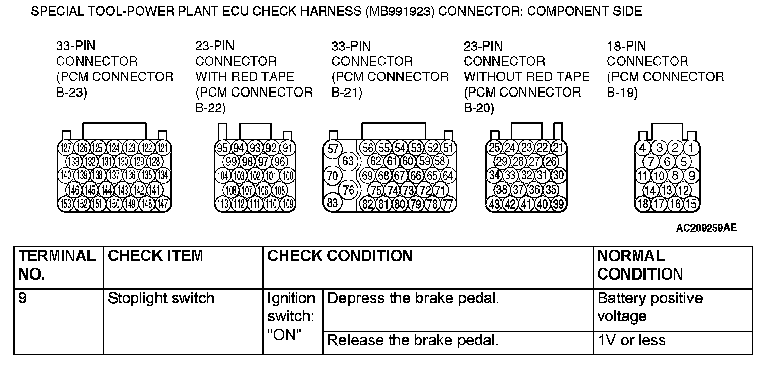 PCM TERMINAL VOLTAGE REFERENCE CHART FOR AUTO-CRUISE CONTROL SYSTEM OPERATION1. Disconnect the PCM connectors, and connect special tool MB991923 (Power plant ECU check harness) in between.