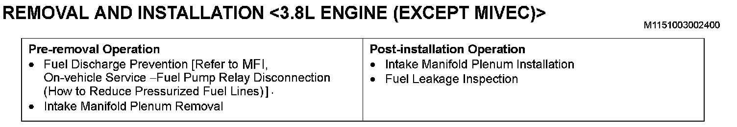 REMOVAL AND INSTALLATION [3.8L ENGINE (EXCEPT MIVEC)]Pre-removal Operation And Post-installation Operation: