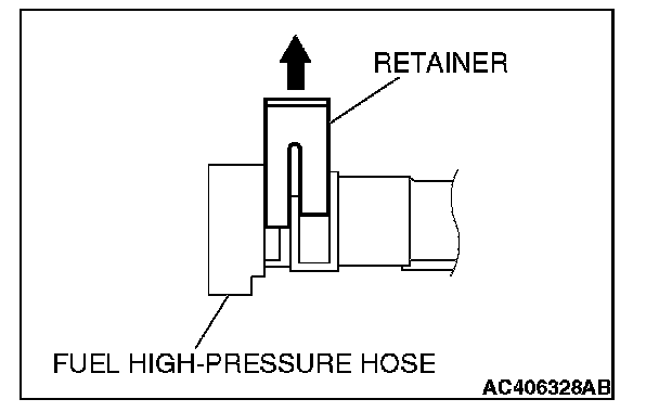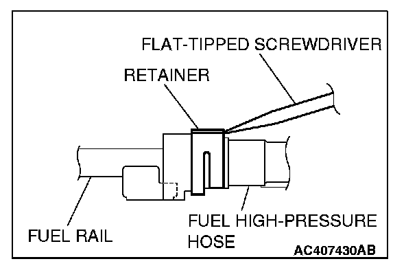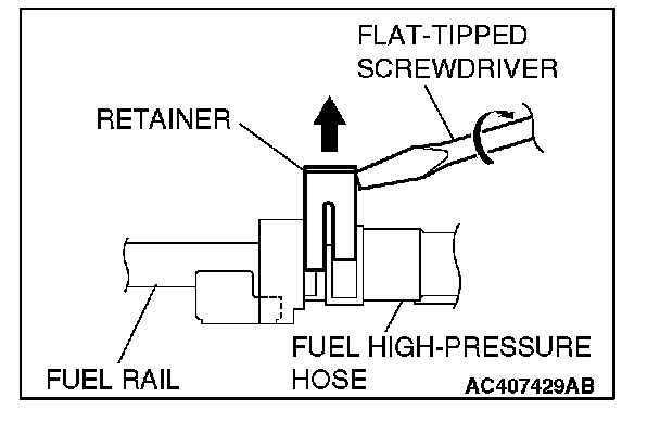 2. Turn the flat-tipped screwdriver approximately 90 degrees to the arrowed direction, and lift the retainer to unlock and disconnect the fuel high-pressure hose.