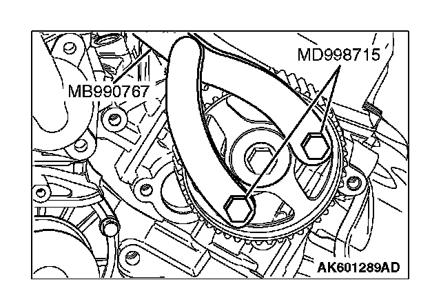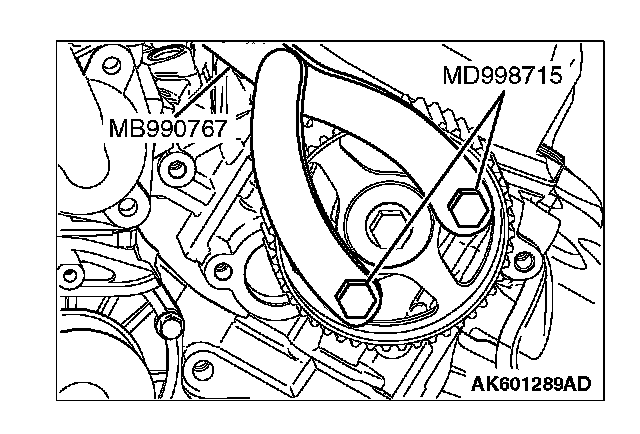 1. While holding the camshaft sprocket with special tools MB990767 and MD998715, loosen the camshaft sprocket bolt.