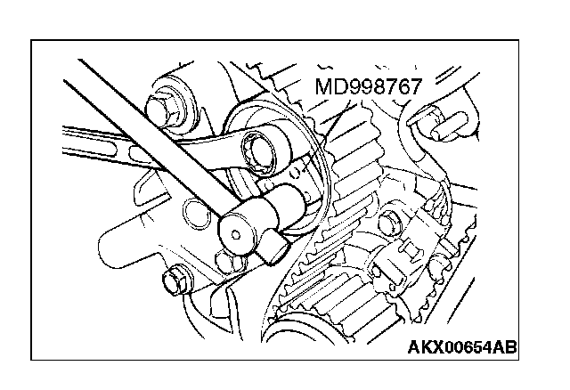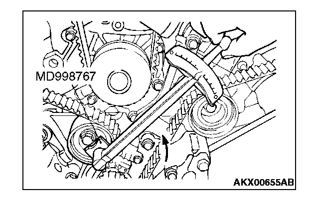 10. Loosen the flange bolt securing the tensioner pulley, and then mount special tool MD998767 and a torque wrench on the tensioner pulley.