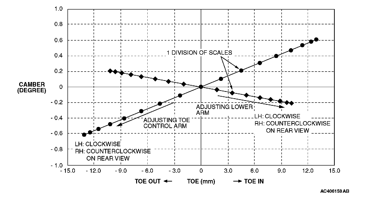 ^ If either the camber or toe is adjusted, both should fluctuate. For the relationship between the two, refer to CAMBER AND TOE REFERENCE TABLE.