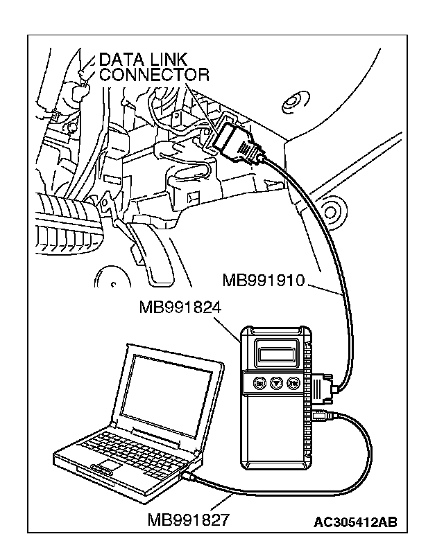 CAUTION: To prevent damage to scan tool MB991958, always turn the ignition switch to the "LOCK" (OFF) position before connecting or disconnecting scan tool MB991958.