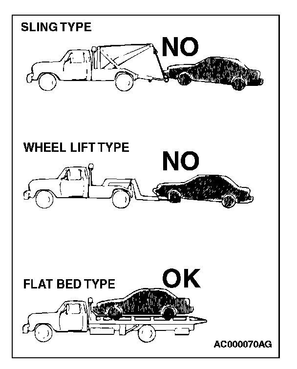 CAUTION: This vehicle cannot be towed by a wrecker using sling-type equipment; otherwise the bumper may become deformed. If this vehicle is towed, use wheel lift or flat bed equipment.