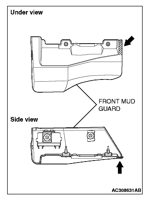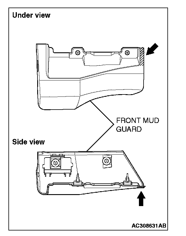 ^ If the assembling support area contacts with the front mud guard (arrow area as shown in the illustration), the front mud guard will be damaged. Slide the assembling support area to the front of the vehicle slightly to prevent the damage.