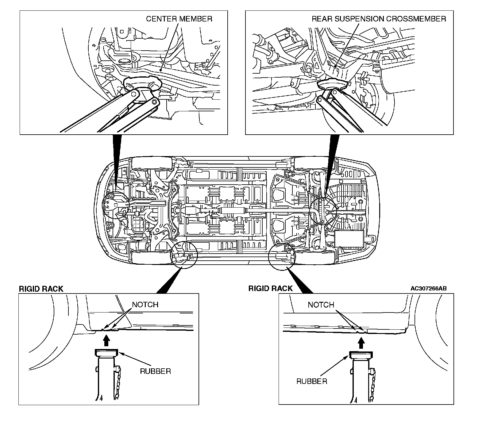 ^ For lifting, put rubber or similar material between the side sill and rigid rack, otherwise the side sill area will be damaged.