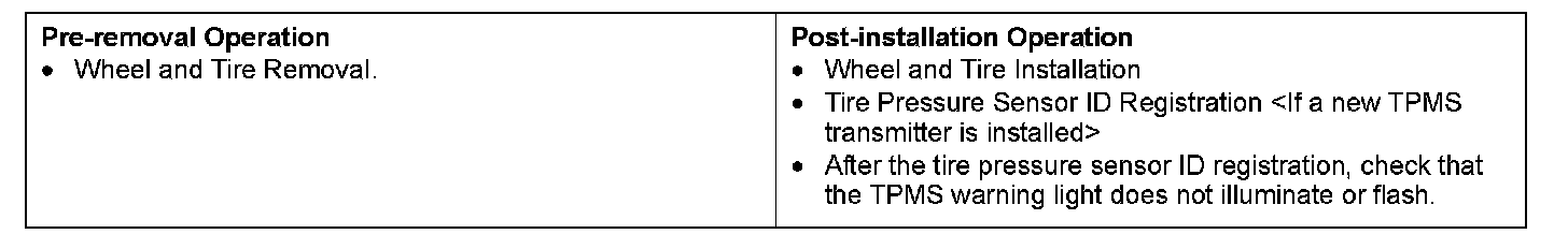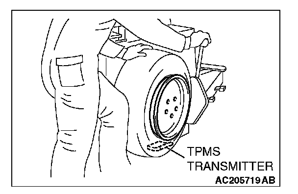 ^ If the TPMS transmitter is replaced, execute "Tire Pressure Sensor ID Registration" on scan tool MB991958 "Special Function." Tire Pressure Sensor ID Registration