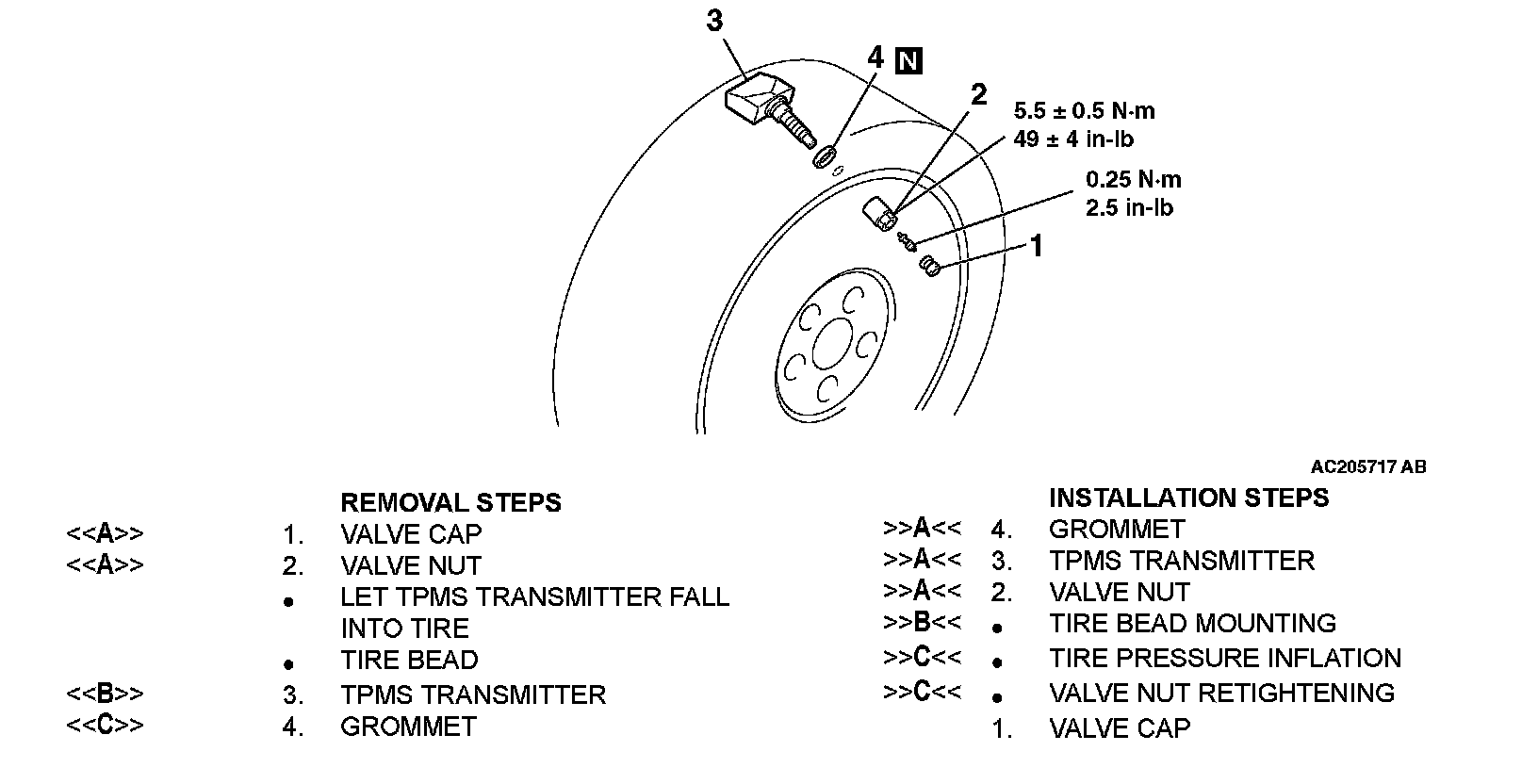 CAUTION: After tire inflation, retighten the valve nut 5.5 ± 0.5 N-m (49 ± 4 in-lb). This is necessary, because the TPMS transmitter is secured to the wheel with the valve nut and rubber grommet. The rubber grommet will be depressed by tire pressure or deteriorate over a period of time, which requires the valve nut to be retightened.