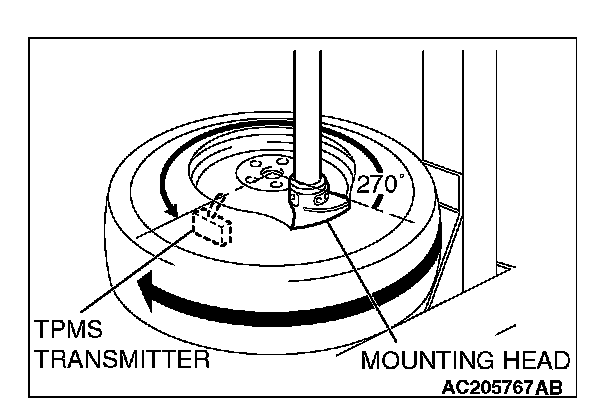 1. Place wheel and tire on turntable of tire mounting machine. Ensure that transmitter is 270° angle (3 o'clock position) from mounting head when the outer tire bead is mounted as illustrated.