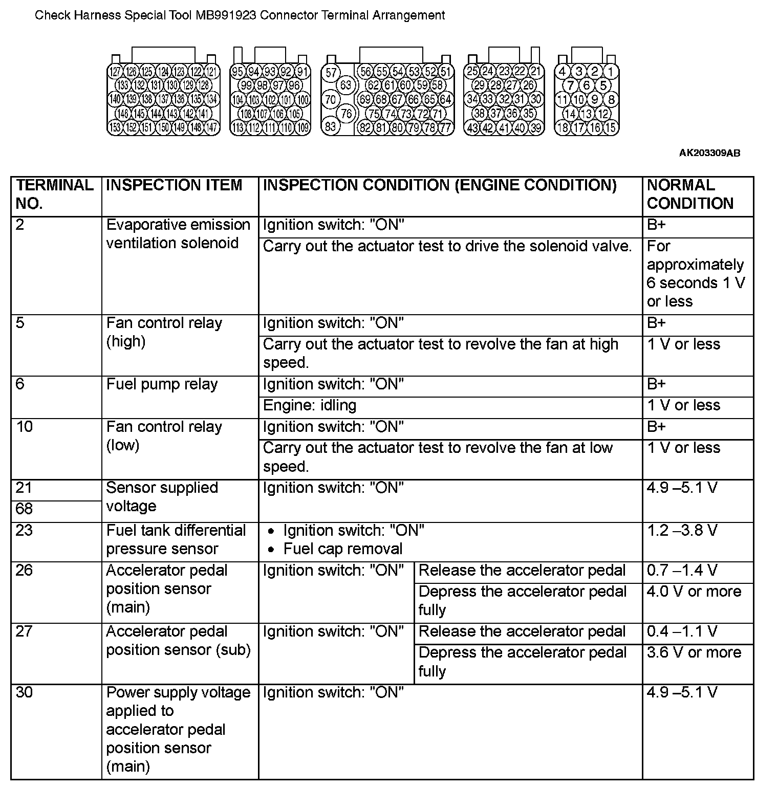 Check Harness Special Tool MB991923 Connector Terminal Arrangement (Part 5):