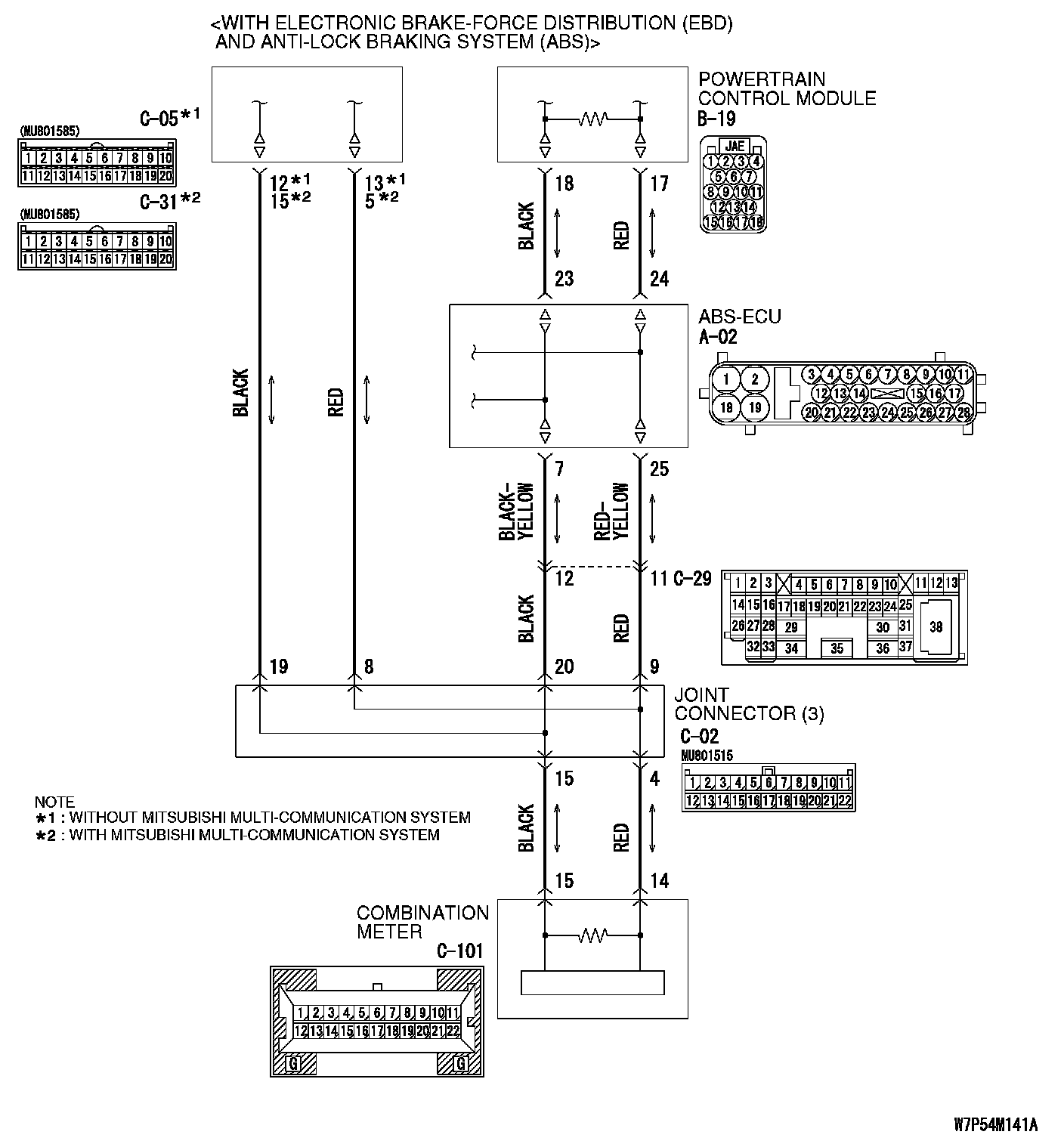 STEP 1. Check joint connector (3) C-02 and multi-center display unit (middle-grade type or vehicles with mitsubishi multi communication system) connector C-05 [multi-center display unit (middle-grade type)] or C-31 [multi-center display unit (vehicles with mitsubishi multi communication system)] for loose, corroded or damaged terminals, or terminals pushed back in the connector.
