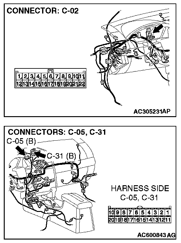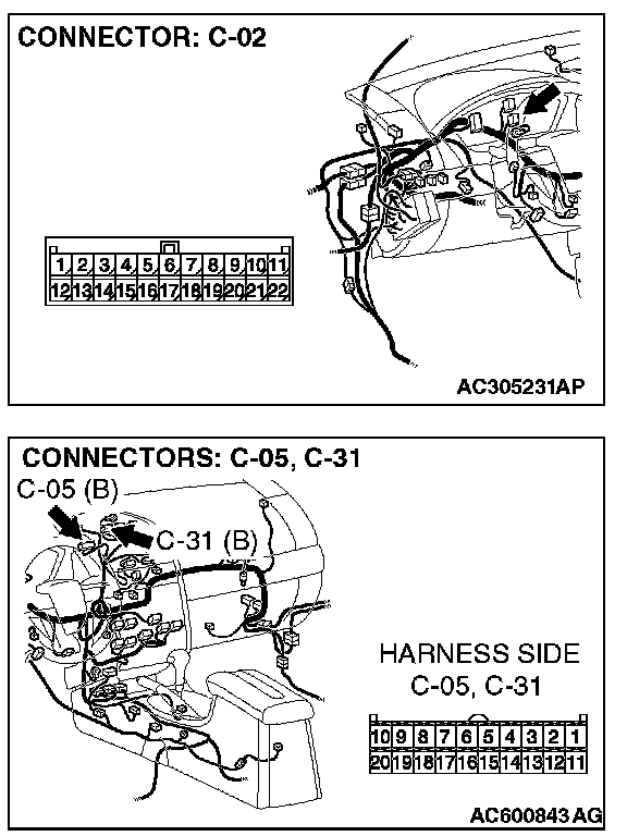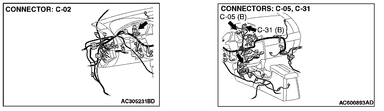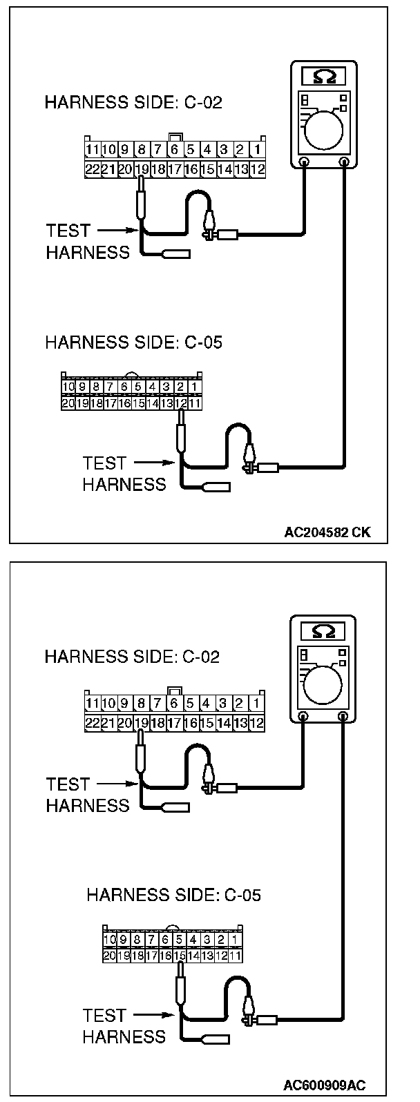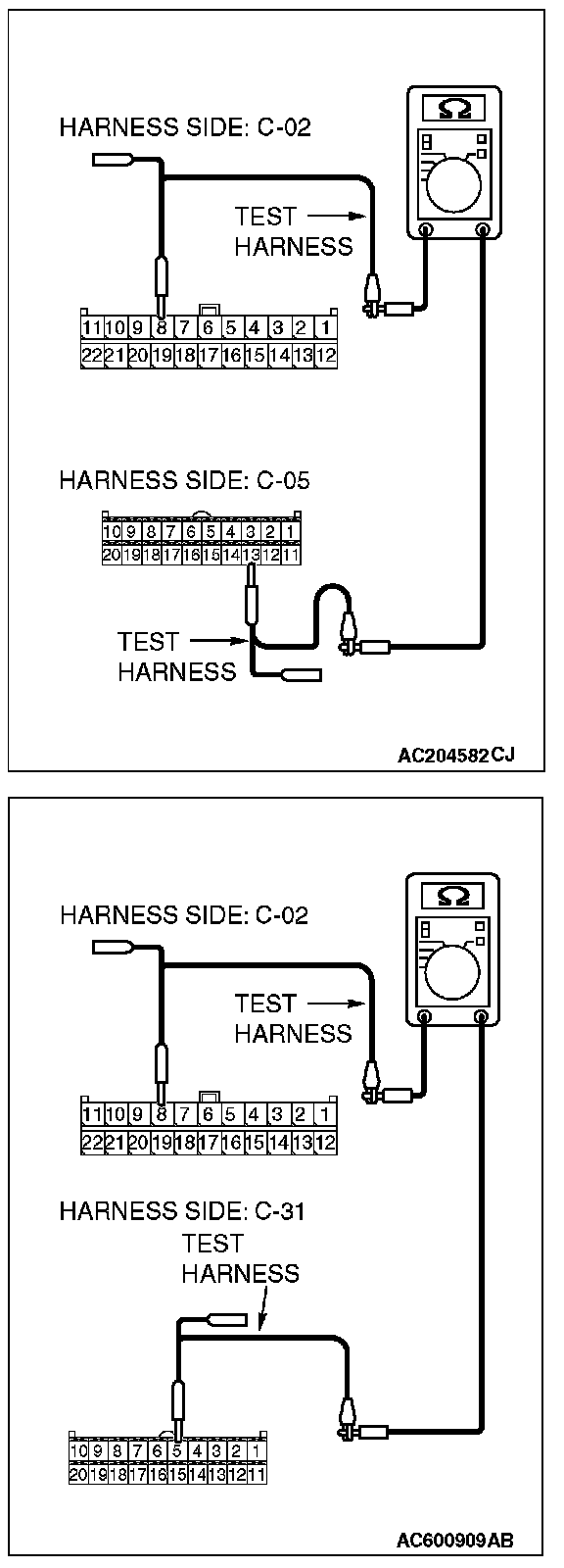 1. Disconnect joint connector (3) C-02 and multi-center display unit (middle-grade type or vehicles with mitsubishi multi communication system) connector C-05 [multi-center display unit (middle-grade type)] or C-31 [multi-center display unit (vehicles with mitsubishi multi communication system)], and measure the resistance at the wiring harness sides of joint connector (3) C-02 and multi-center display unit (middle-grade type) connector C-05.