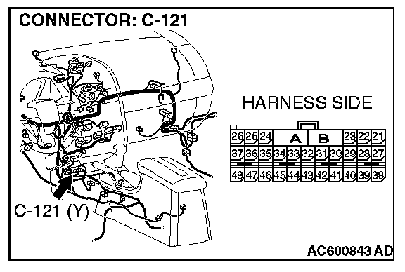 STEP 42. Check SRS-ECU connector C-121 for loose, corroded or damaged terminals, or terminals pushed back in the connector.