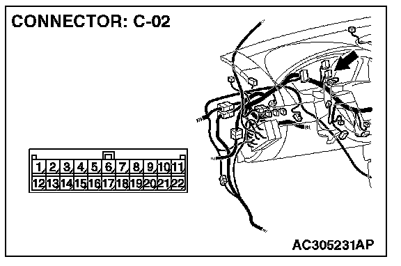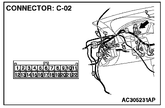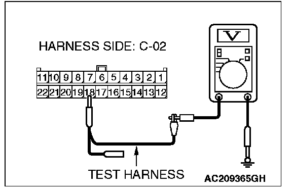 1. Disconnect joint connector (3) C-02 and multi-center display unit (middle-grade type or vehicles with mitsubishi multi communication system) connector C-05 [multi-center display unit (middle-grade type)] or C-31 [multi-center display unit (vehicles with mitsubishi multi communication system)], and measure the voltage at the wiring harness side of joint connector (3) C-02.