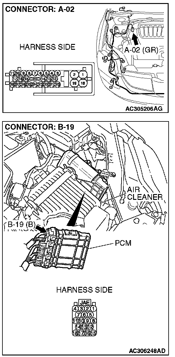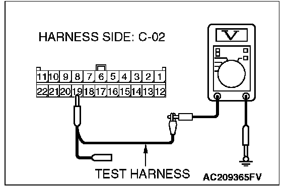 1. Disconnect powertrain control module connector B-19 and ABS-ECU connector A-02, and measure the voltage at the harness side of powertrain control module connector B-19.