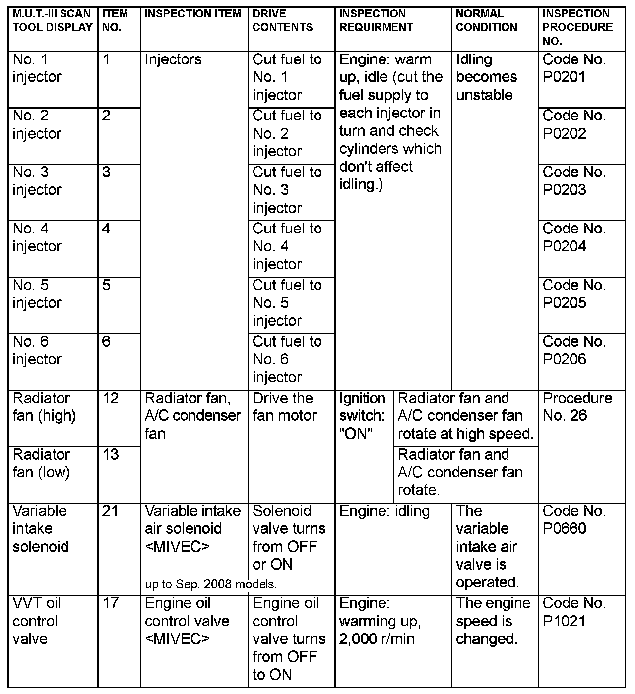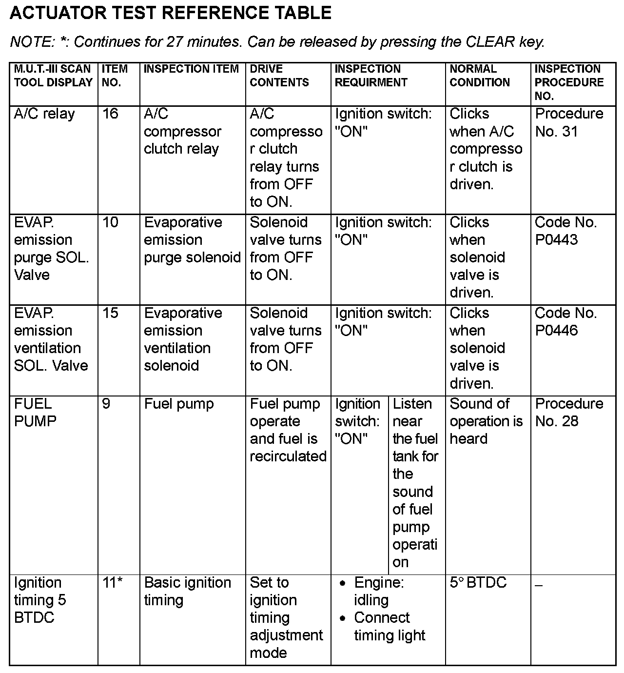 Actuator Test Reference Table (Part 1):