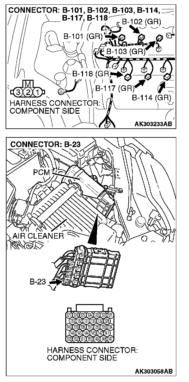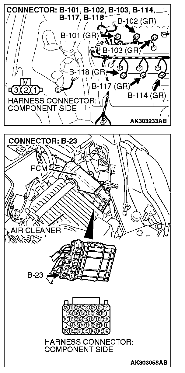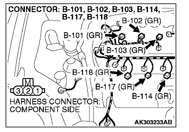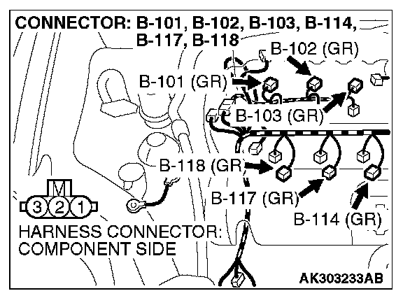 STEP 4. Check the circuit at ignition coil harness side connectors B-101, B-102, B-103, B-114, B-117, B-118.