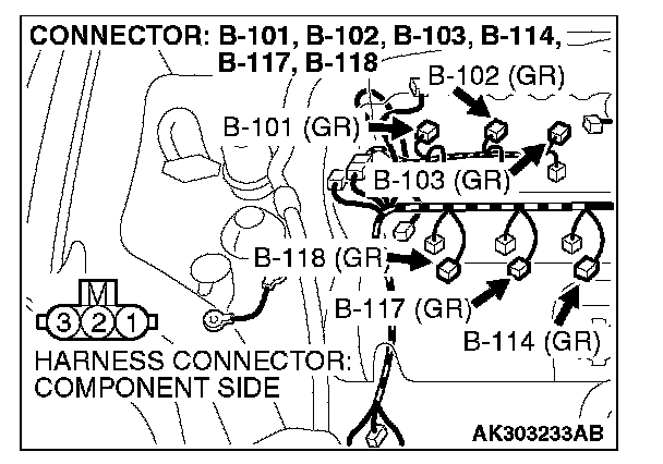 1. Disconnect the connectors B-101, B-102, B-103, B-114, B-117, B-118 and measure at the harness side.