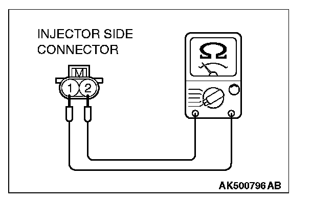 3. Measure the resistance between injector side connector terminal No. 1 and No. 2.