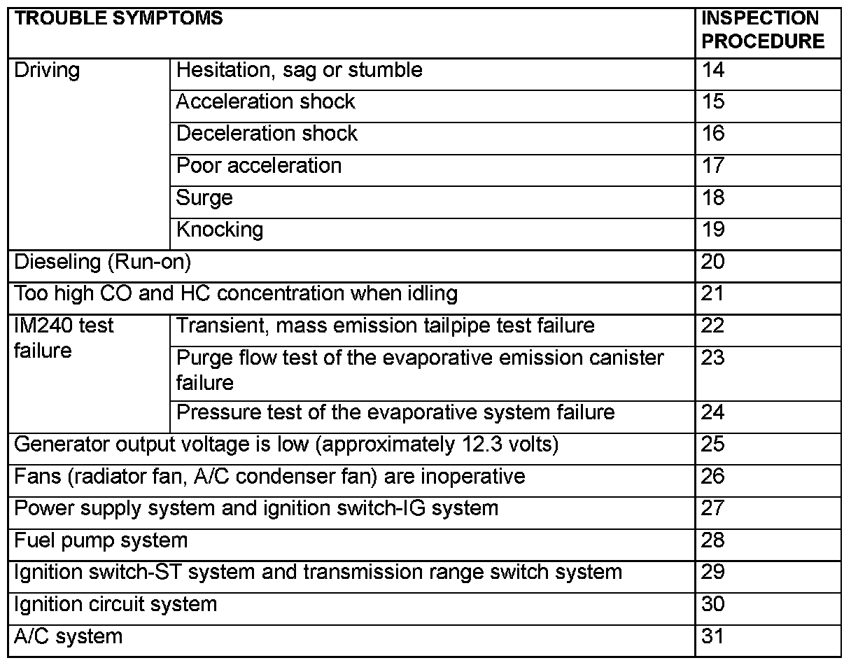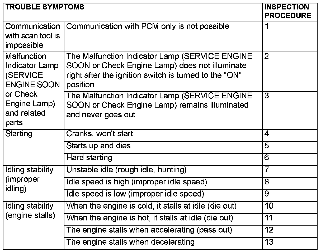 SYMPTOM CHARTWARNING: When touching the throttle valve, surely shut off the driving circuits of the throttle valve. In the event that the throttle valve is operated, a finger might be injured as the result of being caught by the throttle valve.